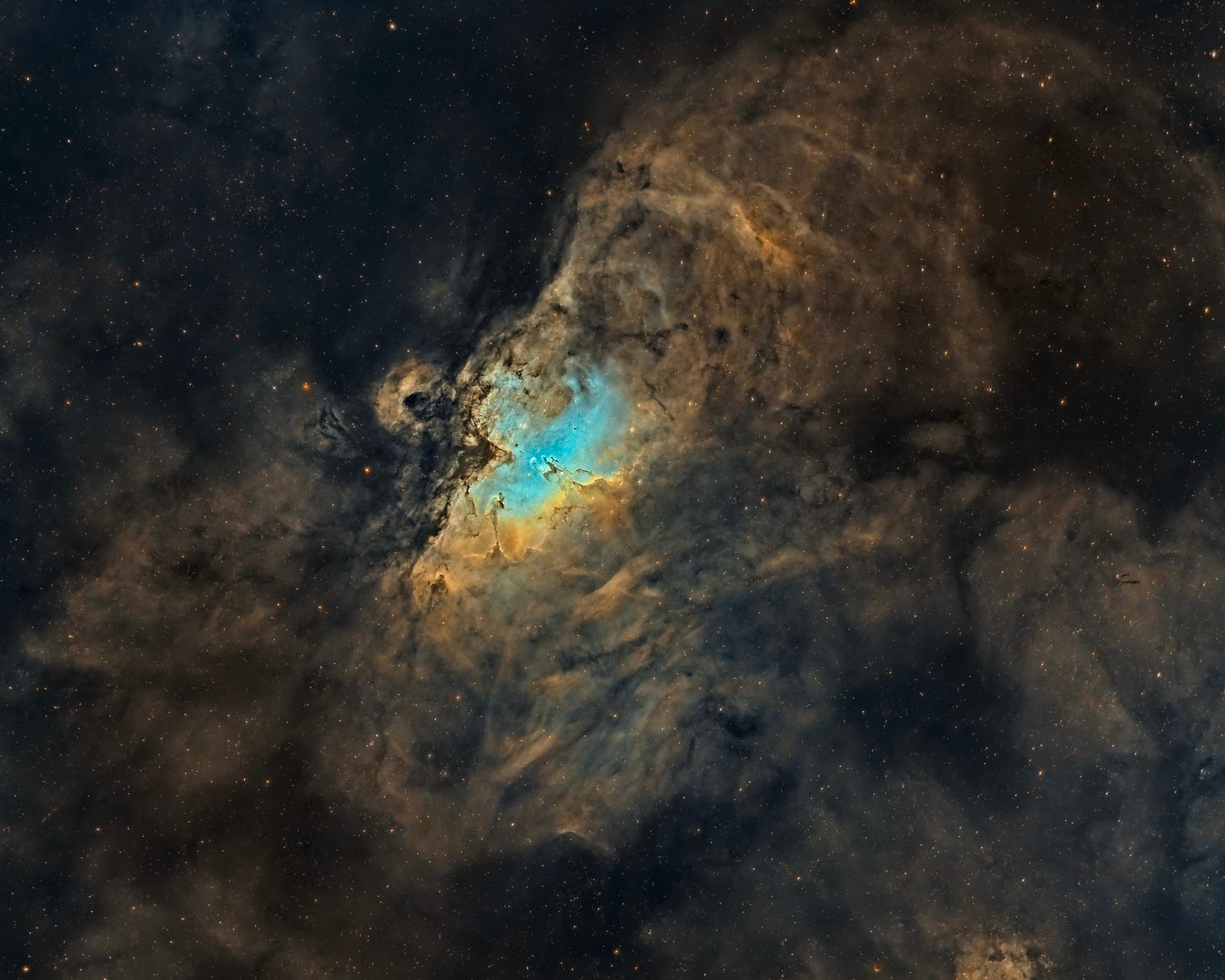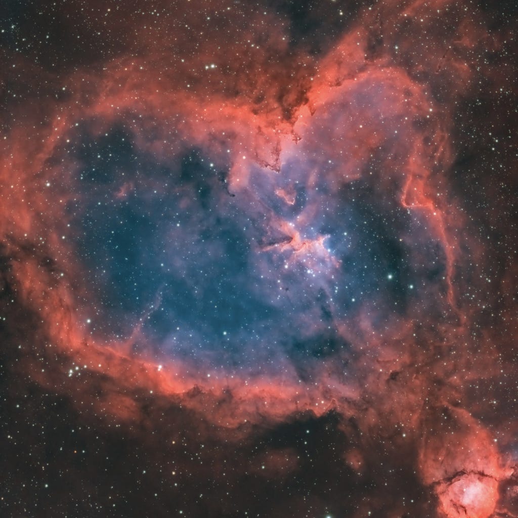 This is the Eagle Nebula (M16) shot from my balcony in West Hollywood, CA. It is processed using the Hubble pallet (Sulphur = Red, Hydrogen = Green, Oxygen = Blue) and has the very famous Pillars of Creation in the middle (zoom in and you’ll recognize the famous Hubble Telescope image).