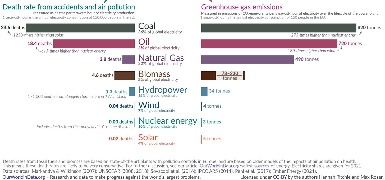 Three pretty major accidents in ~75 years of nuclear power seems like a lot, but when you consider it on a per TWh basis (a comparable unit of electricity generation) the results are striking, especially if you compare it to CO2 emissions. Accidents will always be there (energy is dangerous by definition), but nuclear reactors are designed specifically to avoid them as best as possible, and the latest generation of reactors are even safer and have even more “walk-away” safety features. Don’t take my word for it either, there are tons of resources on this, and I am just citing my favorites.
