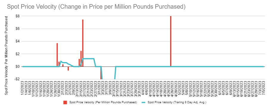These charts are pretty standard ways to view this, but below is my personal favorite, and one that I think shows a lot about current market tightness: the spot velocity. This was a measure I made up and helps showcase how tight the market is because it is defined as: